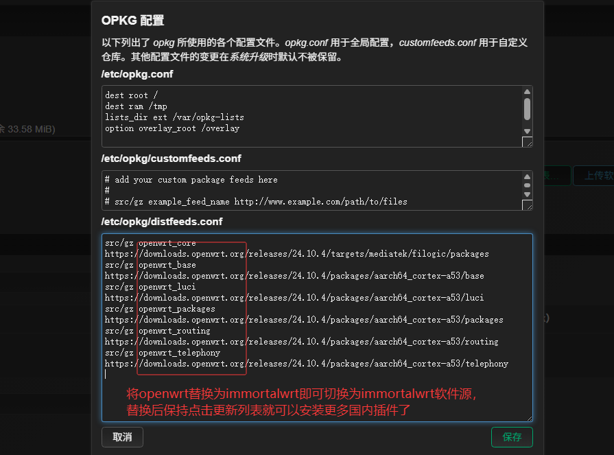 替换为immortalwrt软件源的方法很简单,只需要在软件源配置中将openwrt域名替换为immortalwrt即可